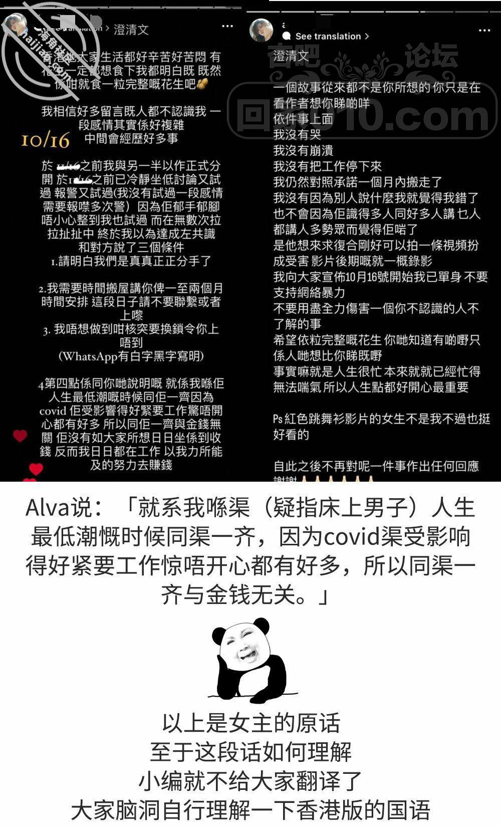 昨日(23日)网上疯传一段疑似本地饮食界名人捉奸影片,有指其伴侣疑带一名男友返家偷食,“戴绿帽”的男事主更与奸 夫当场对质。影片流出后引起网民讨论,女事主被起底原来是KOL Alva,她事后默认是事件中的女主角,又透露自己已跟捉 奸的男事主分手,并暗示被对方家暴。