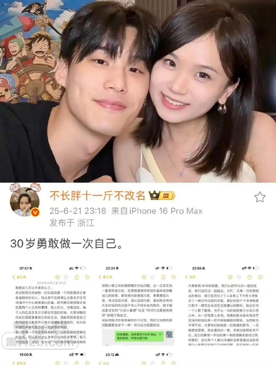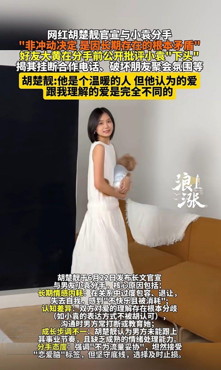 2025年6月21日,拥有700万粉丝的网红胡楚靓发长文宣布与小5岁男友小袁分手