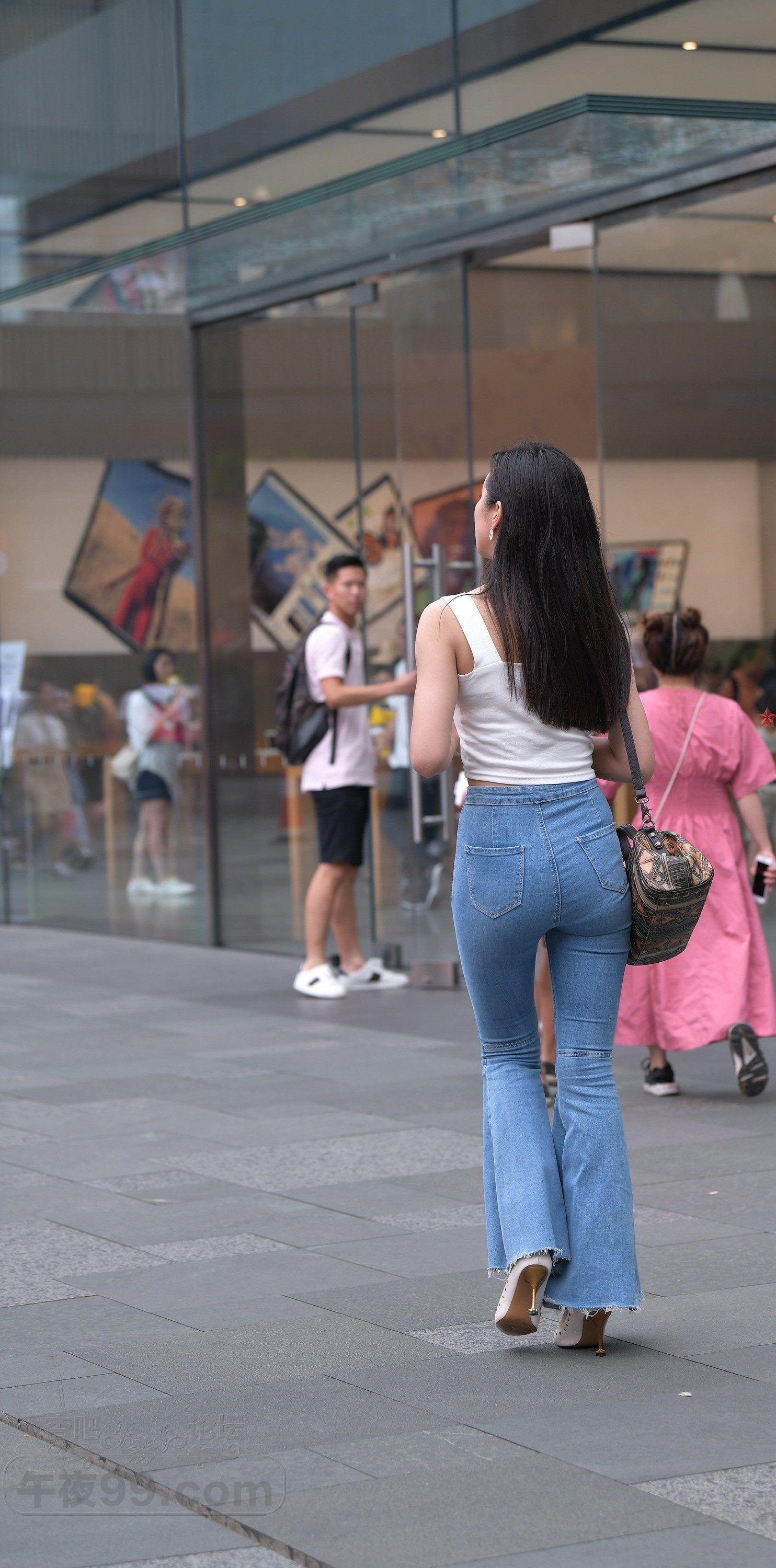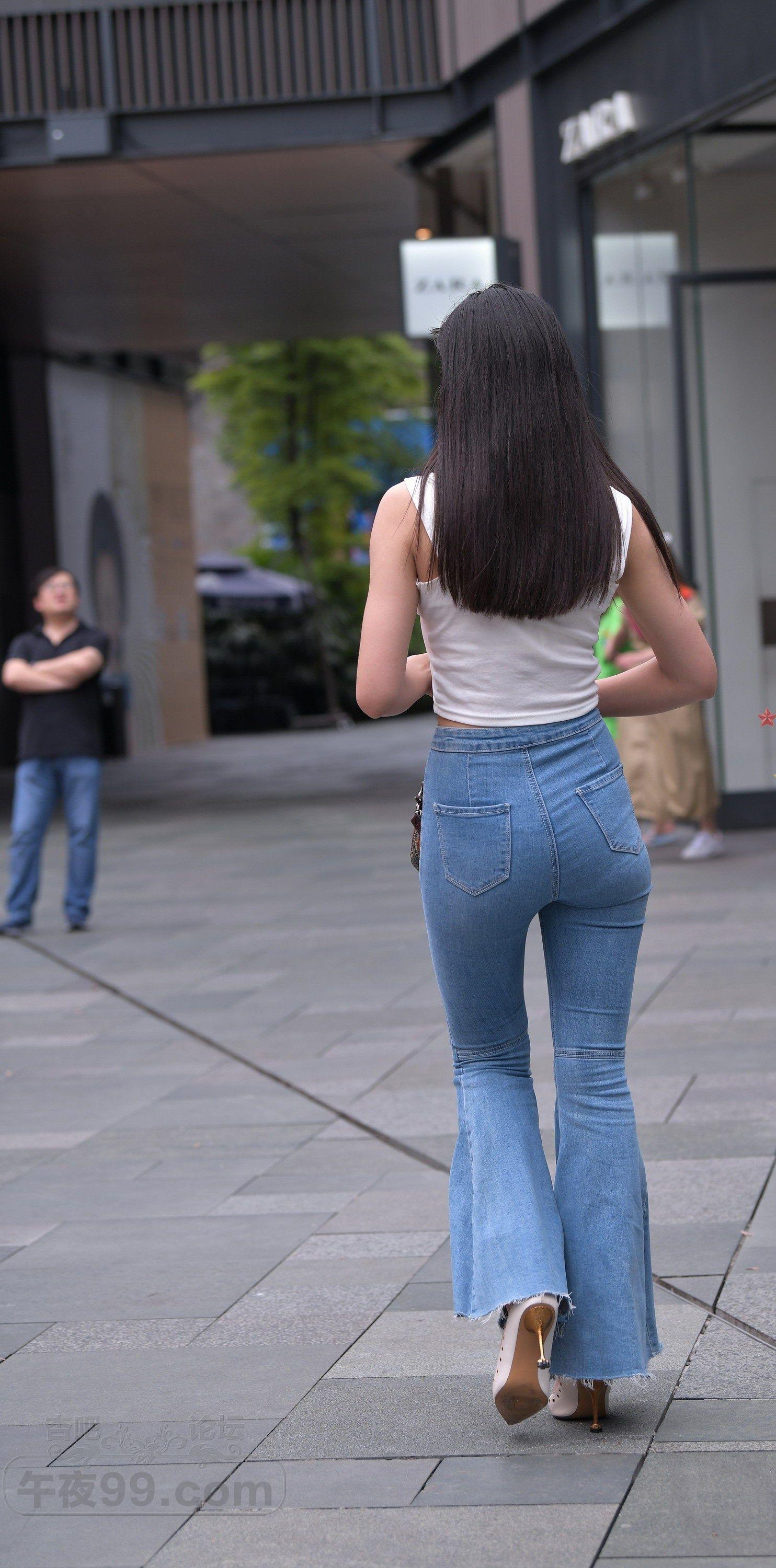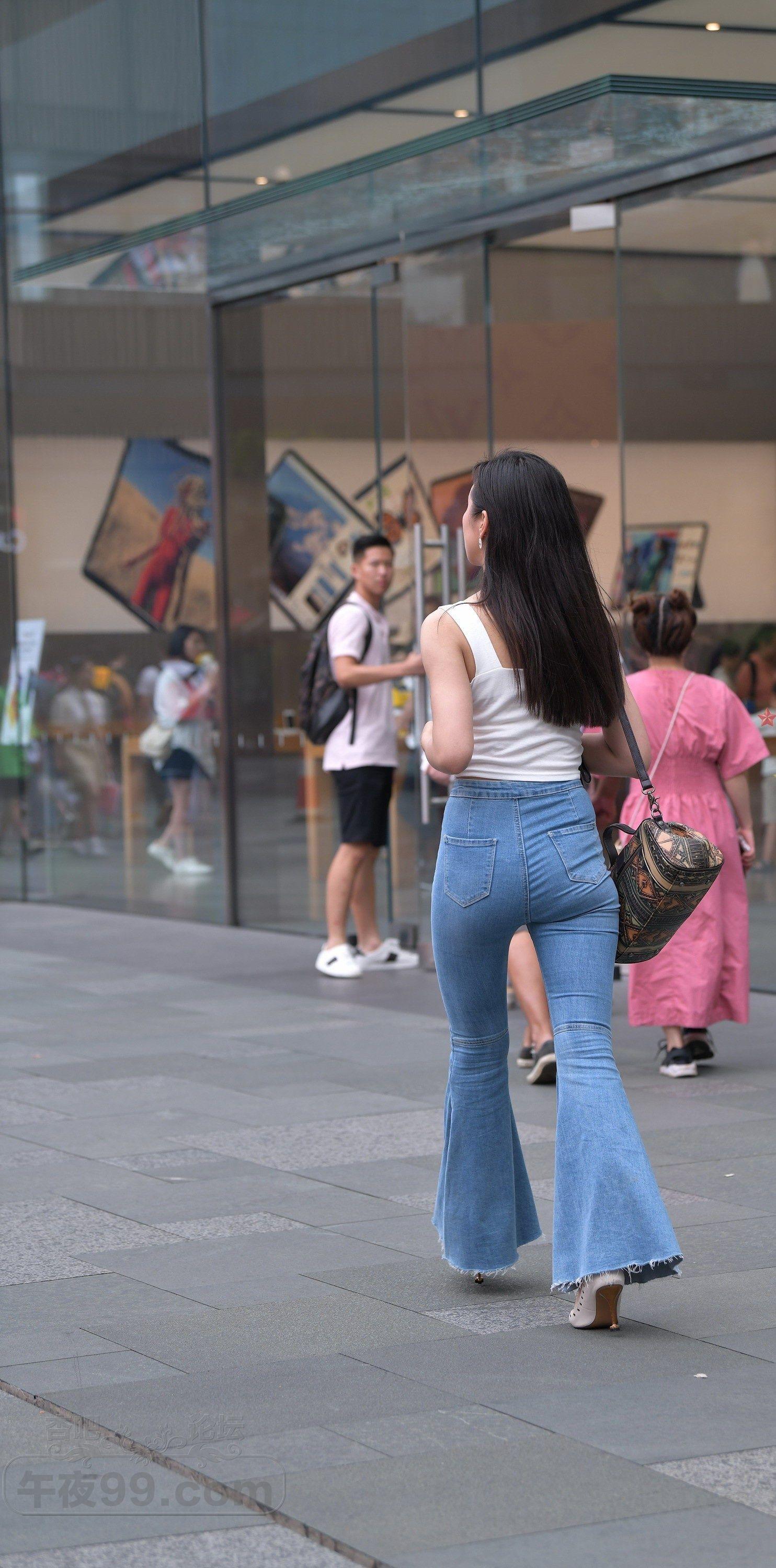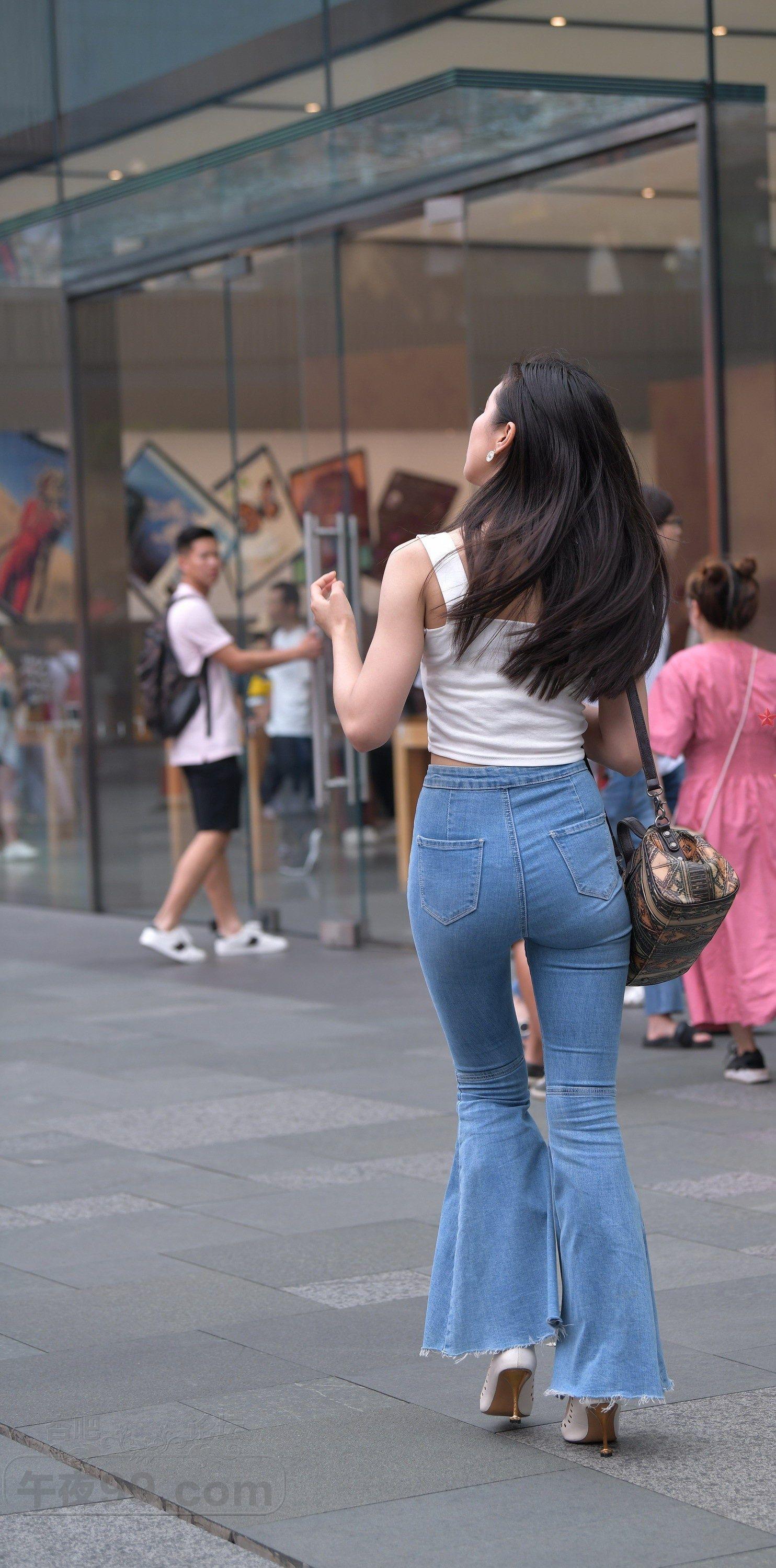 白色背心牛仔喇叭裤长发美女细腰翘臀显身材【10P】