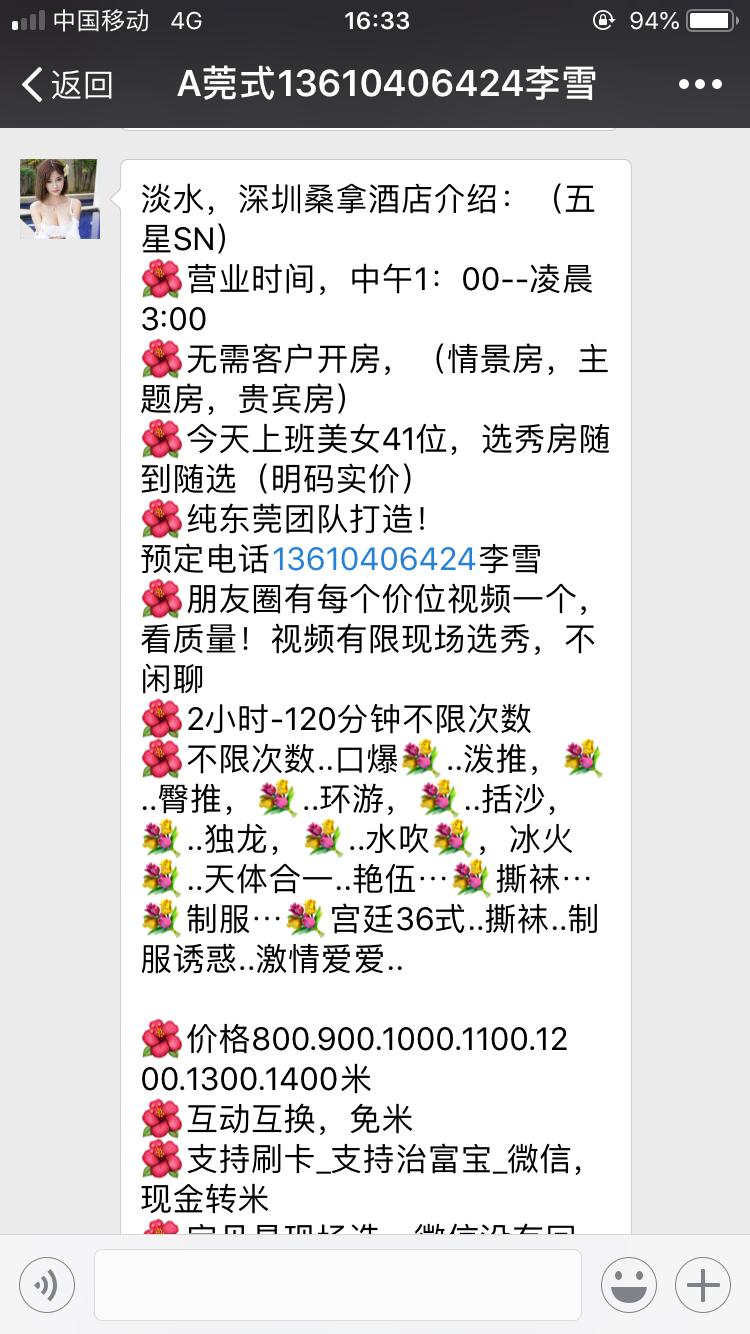 【寻欢时间】:2018年4月10日 【寻欢地点】:惠州 【信息来源】:论坛 【服务项目】:应付一下 【妹妹数量】:5 【环境设备】: 【营业时间】: 【价格一览】:1700/2 【安全评估】:30。 【服务星级】:★(最高5星)应适当评价质量 【重点推荐】:没有 【联系方式】:[unfree]13610406424,微信snn6424[/unfree]13610406424,微信snn6424 【寻欢细节】:因为之前一直都传说惠州淡水接过了东莞的枪,所以一直对惠州念念不忘。终于有机会去深圳出差,就想去惠州玩一下。在一个惠州的论坛找到这个联系方式,加完后,明确问了一下是不是海选,是不是莞式服务,肯定的告诉我是。从深圳到惠州,再到酒店,打电话,说让等着。一会来了辆车,进车后后排坐着两个妹子,根本不是海选,价格也不对,全是骗人!!既然来了,就和鸡头说要个岁数小点的,告我是18岁,见真人真的是很一般,而且后来问的是21,既然来了就随便将就了, 1700,两次两小时。和妹子到公寓,整个服务太差了!!完全被骗了,只能说东莞已死,淡水也没有了,大家不要再有什么幻想了,否则就只能被骗了。我把聊天截屏和鸡头的联系方式发下,请版主直接公开,各位狼友不要再上当了! 【附带照片】: 【验证截图】: